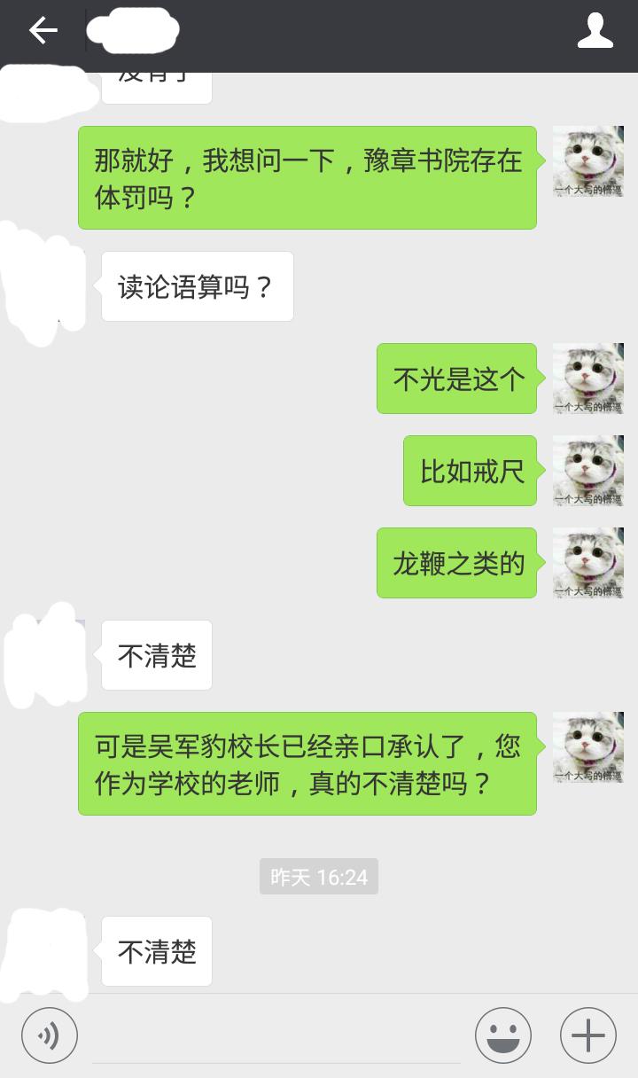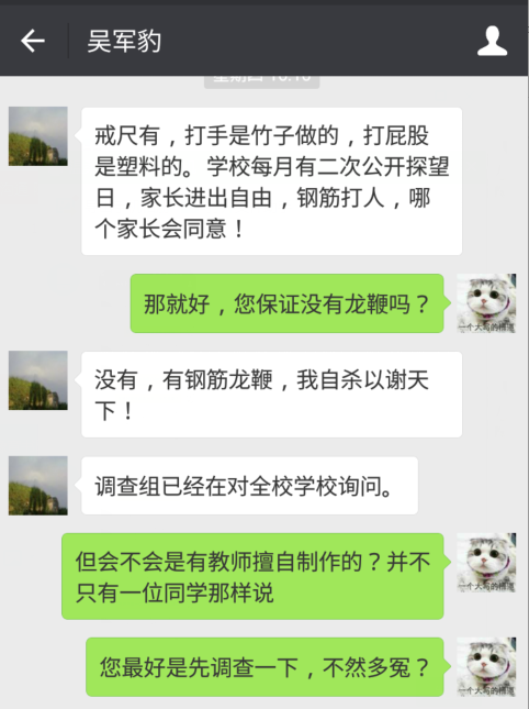 吴军豹校长承认自己的学校存在体罚现象,还通知家长?且不说我得到的消息是你根本没通知家长,就算通知了家长,家长自己都不可以体罚孩子,他们拿什么授权给你?还是说你根本没意识到这违法,顺口就告诉我了?