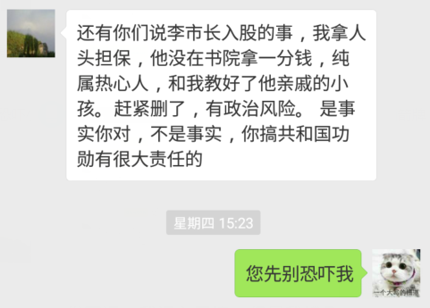 我前天上午,那篇文章发出去不到五个小时,2k赞左右的时候,你们豫章书院的校长就亲自找上来了。