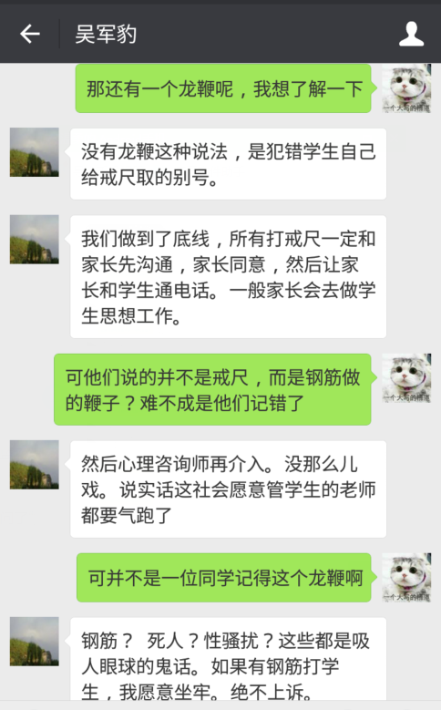 当我问到打死学生这种并没有确切把握的事情时,他的回复变成了“没有听说过,也没有见过”,和上面简短的不清楚,不知道有着明显的区别。